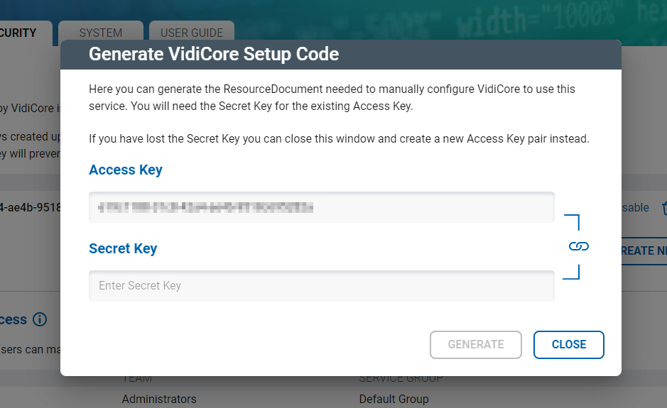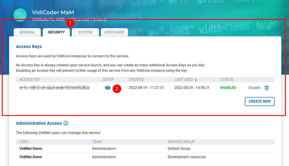 Start by finding the service you want to add in the VidiNet Dashboard, and click on the Security tab (1). This then offers a list of the access keys. Click on the setup icon (2) to expand and see the details.